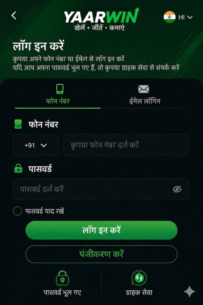 - अपने YaarWin Game Account में Login करें Official YaarWin Game app या website खोलें और अपने registered मोबाइल नंबर और password से sign in करें।